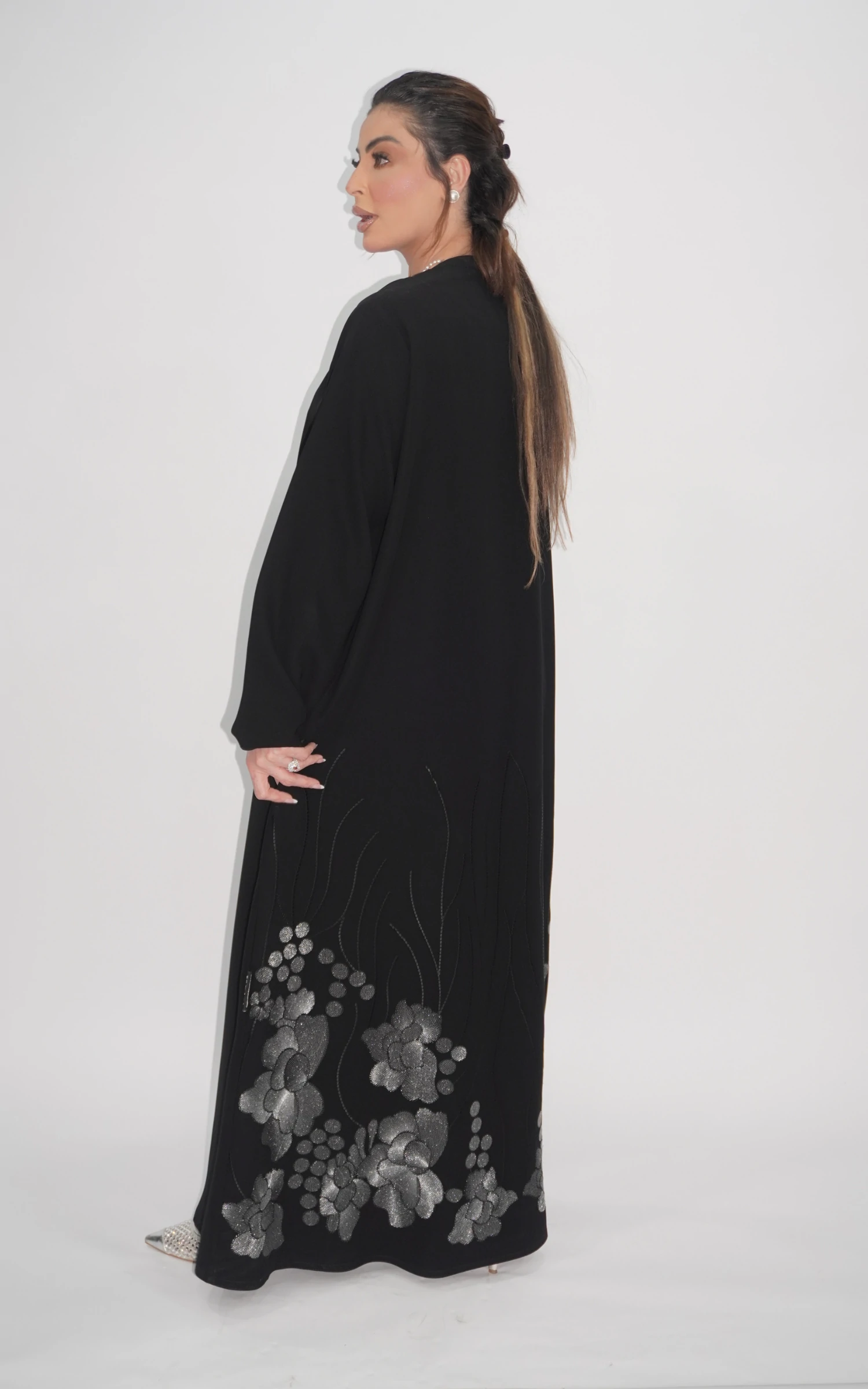 Crafted from our premium Cuba fabric, this abaya offers a smooth, fluid drape that enhances its natural movement. The embroidery is exclusively placed on the back, designed in shimmering silver and black to create a subtle yet striking contrast. This thoughtful detailing adds depth and dimension while maintaining a minimalist front, allowing the design to reveal its artistry from behind.