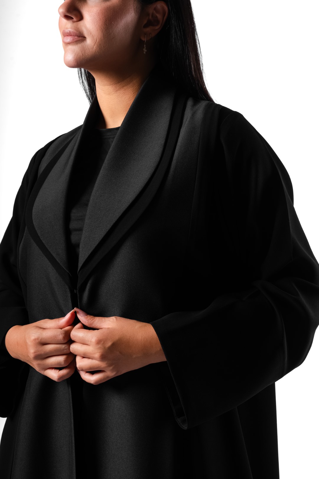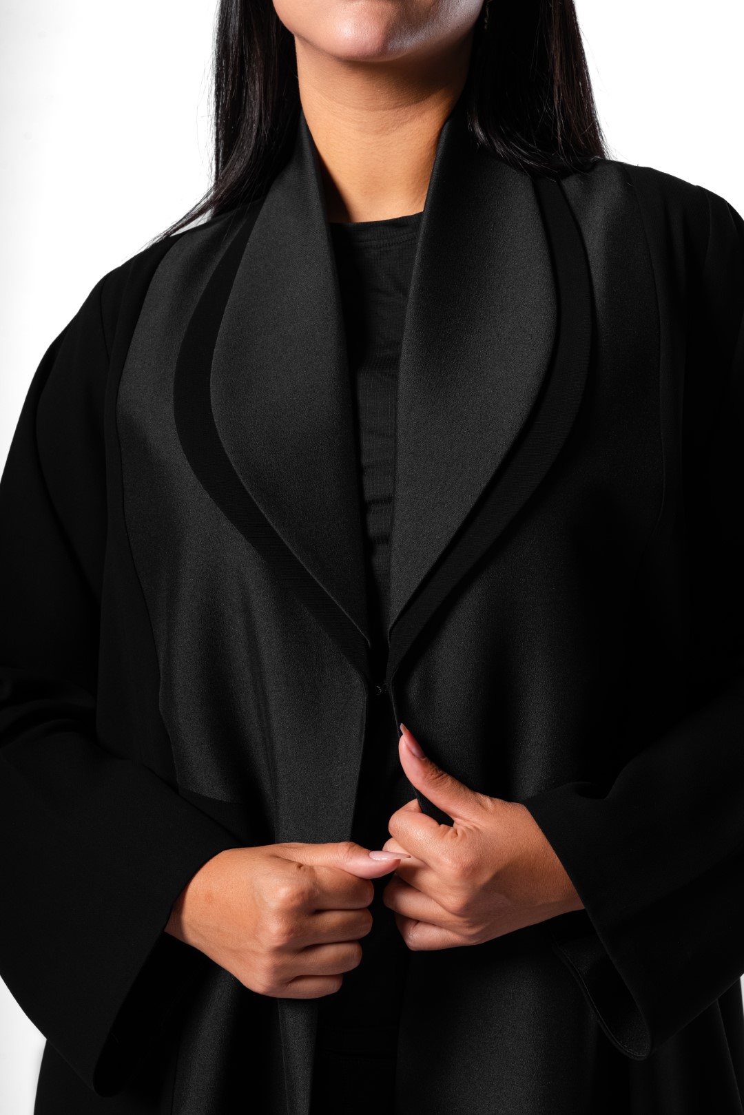 The abaya is a contemporary masterpiece; it’s crafted from a luxurious black fabric that drapes beautifully, creating a flowing and graceful silhouette. The intricate design features a unique cut-out detail on the chest, adding a touch of modern artistry. The subtle Gray trim adds a sophisticated contrast to the black, enhancing the overall impact. The abaya is a timeless and versatile piece that can be styled for any occasion.