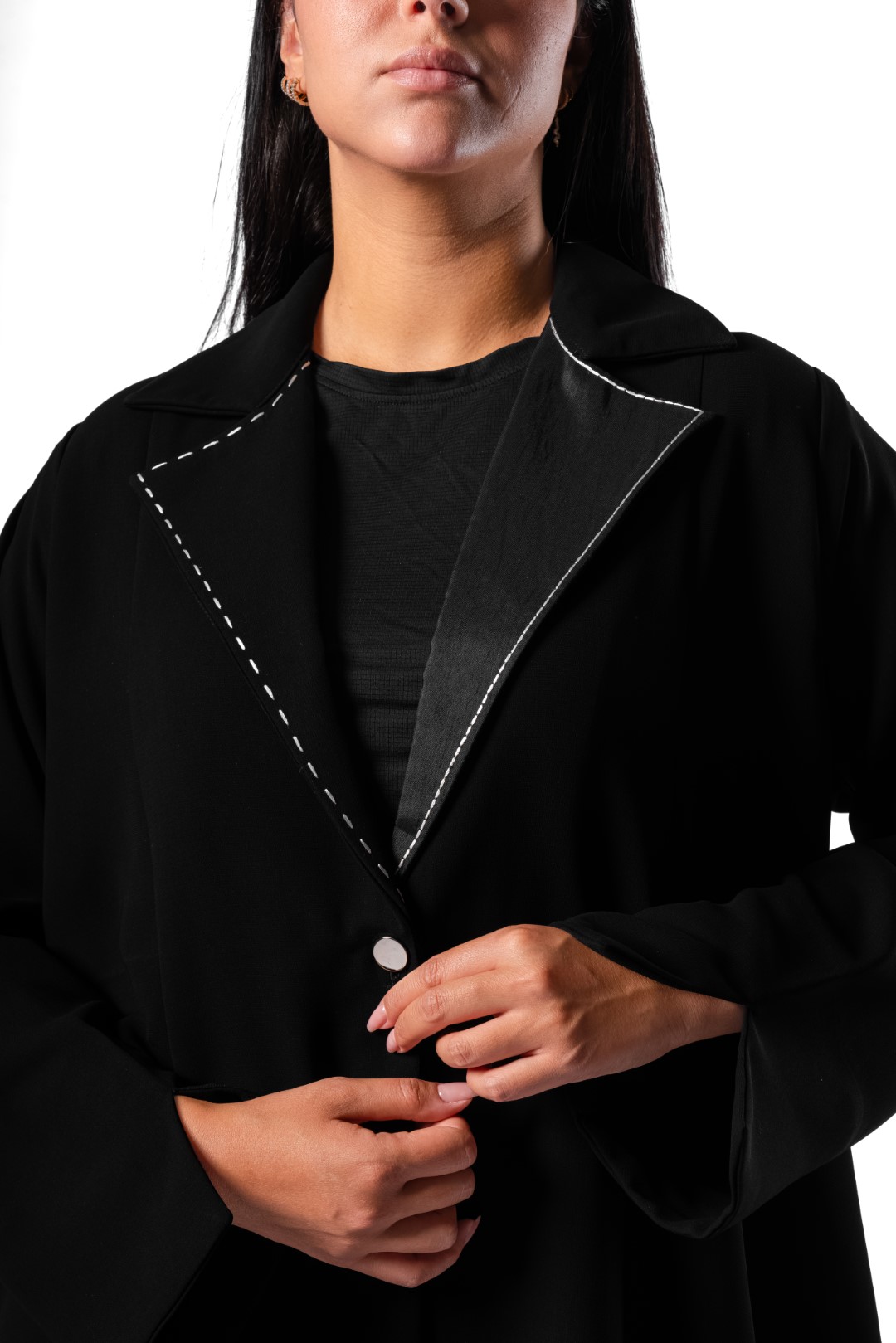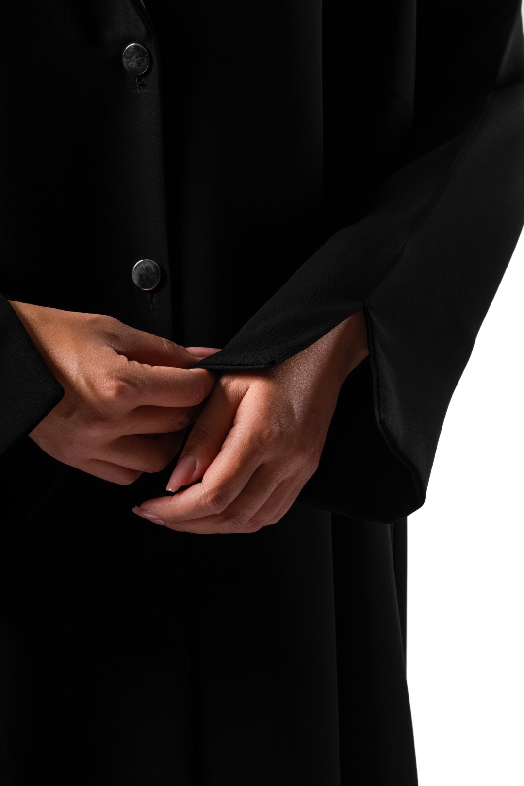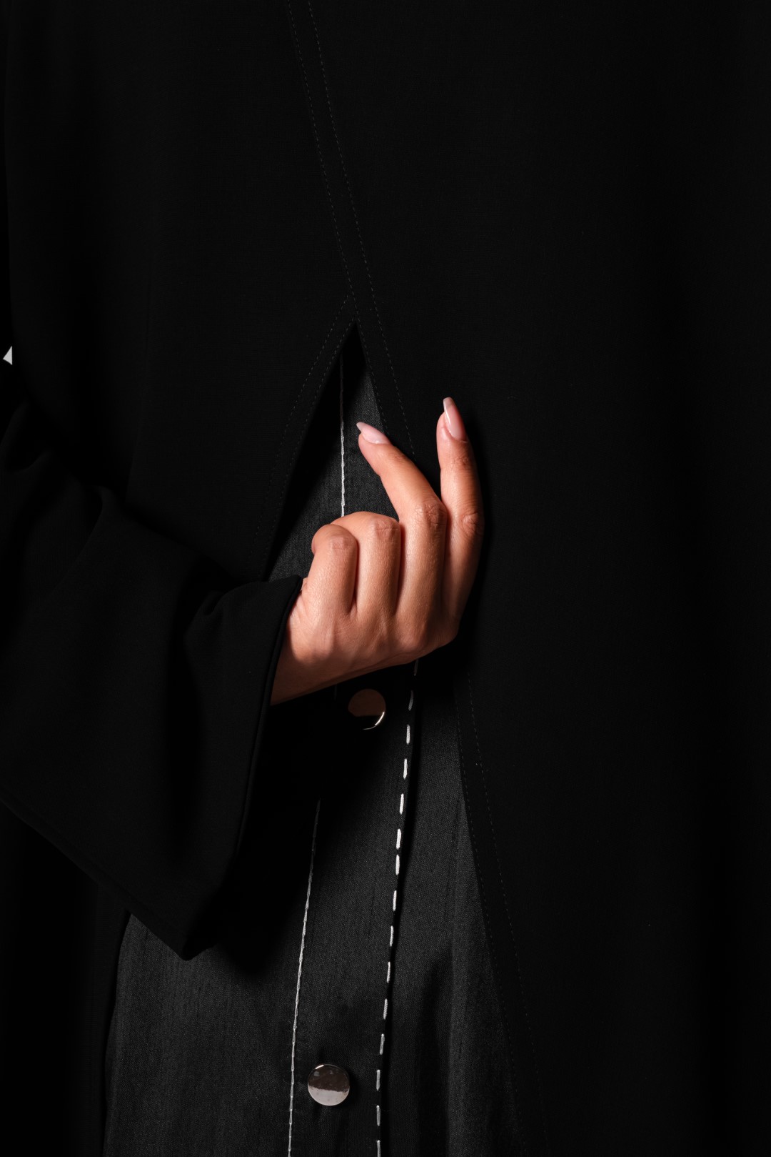 This abaya is a stunning example of minimalist elegance. The sleek black fabric drapes beautifully, creating a flowing silhouette that is both modern and timeless. The subtle embellishment of silver stitching along the collar adds a touch of sophistication, while the zipper closure provides a contemporary edge. The abaya’s simple design allows the wearer’s natural beauty to shine through, making it a truly versatile piece that can be dressed up or down for any occasion. It is a perfect embodiment of understated luxury.