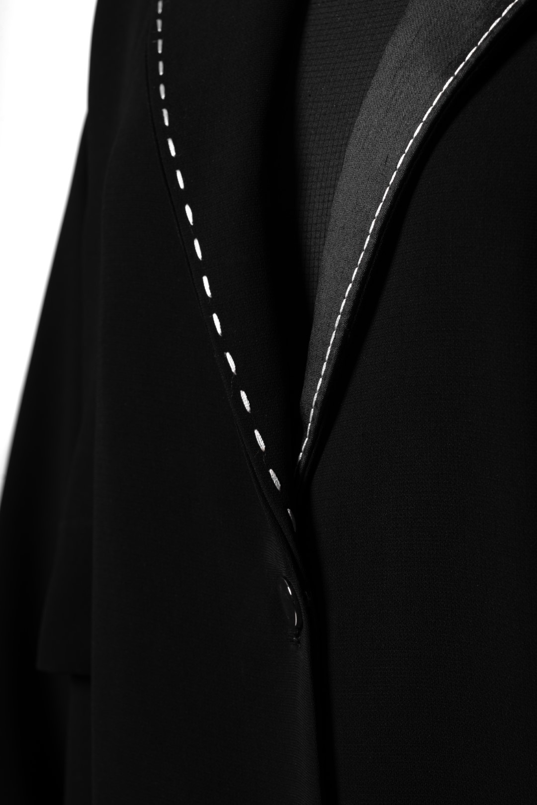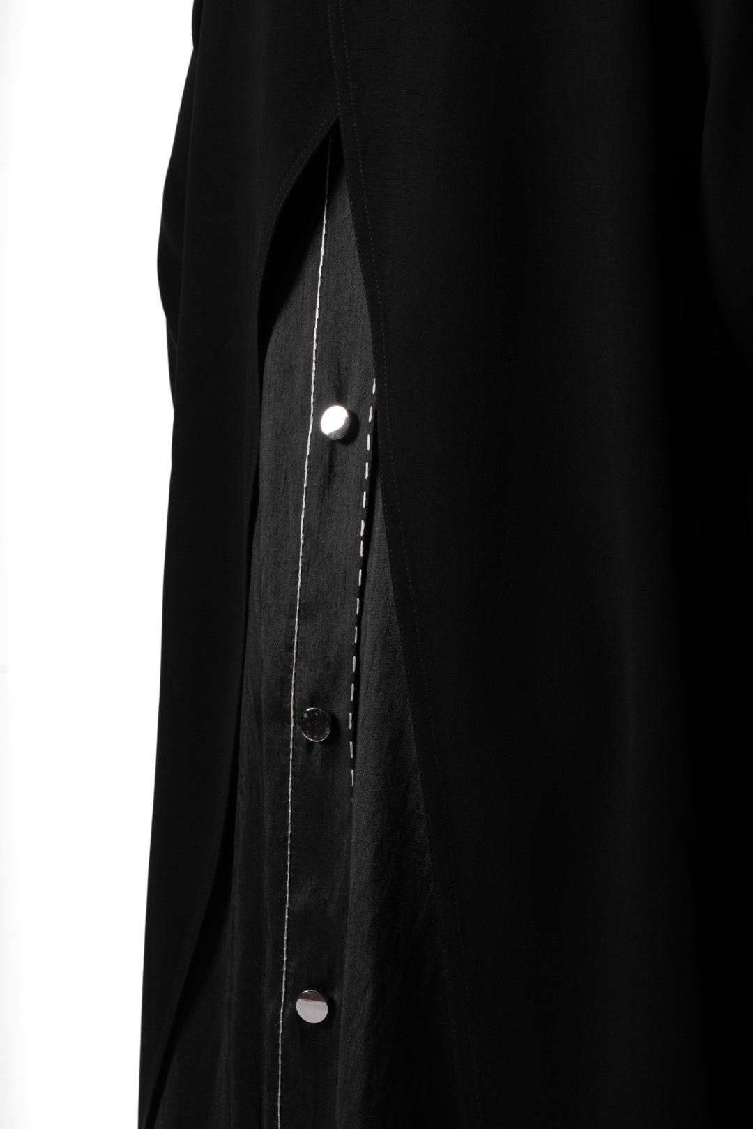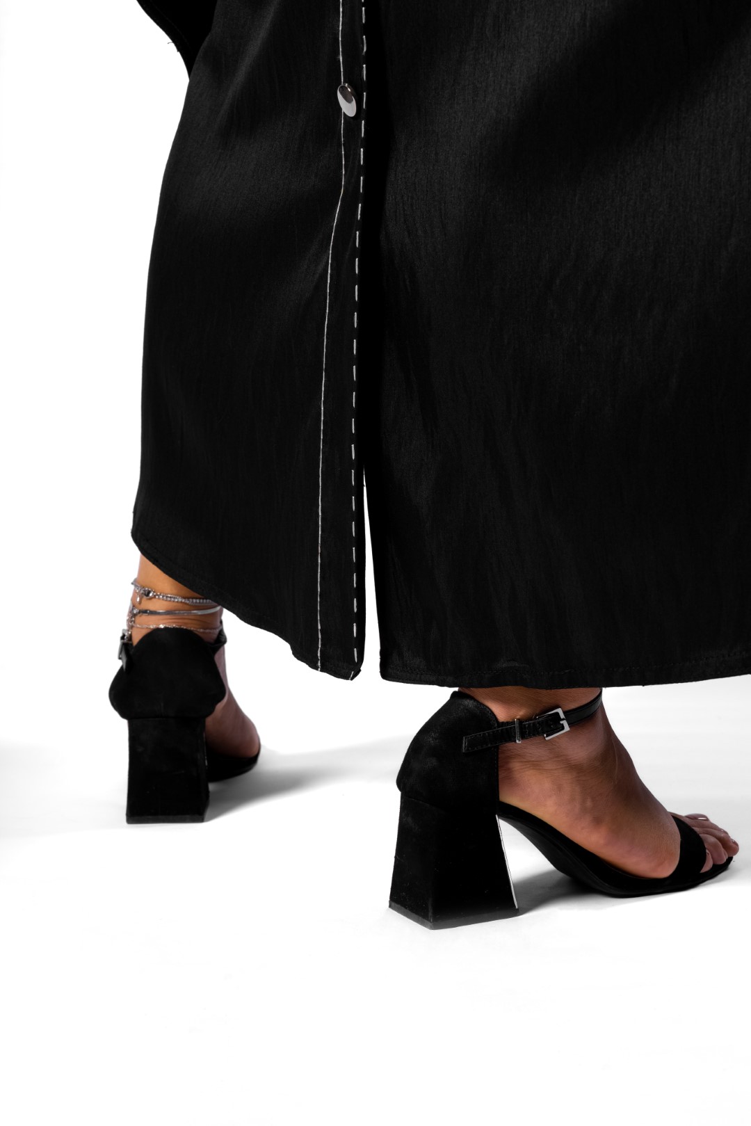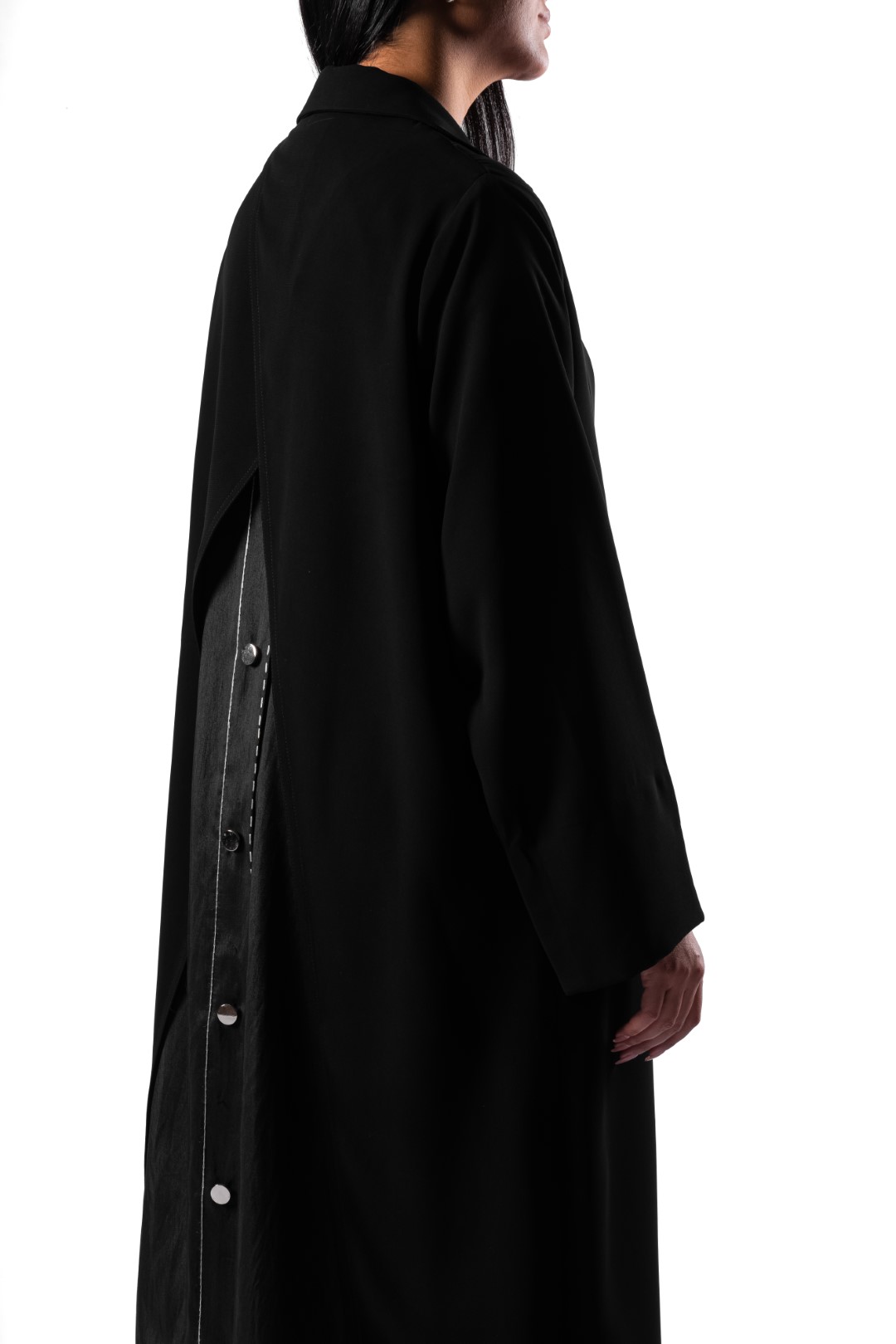 This abaya is a stunning example of minimalist elegance. The sleek black fabric drapes beautifully, creating a flowing silhouette that is both modern and timeless. The subtle embellishment of silver stitching along the collar adds a touch of sophistication, while the zipper closure provides a contemporary edge. The abaya’s simple design allows the wearer’s natural beauty to shine through, making it a truly versatile piece that can be dressed up or down for any occasion. It is a perfect embodiment of understated luxury.