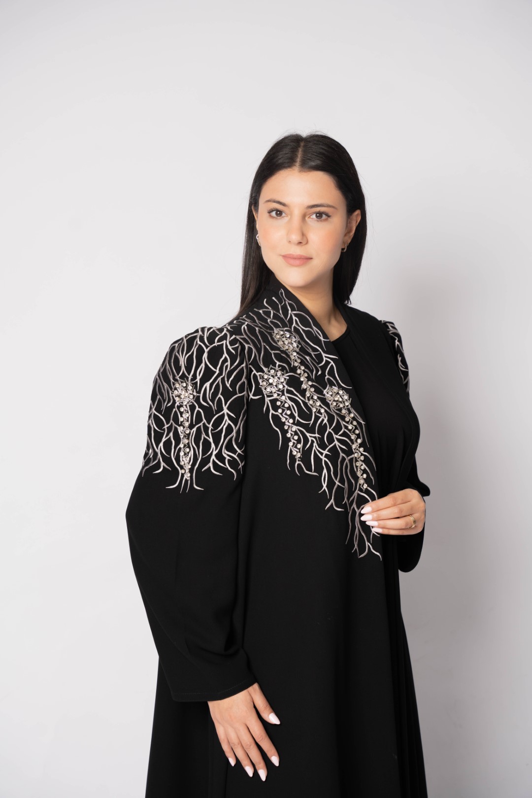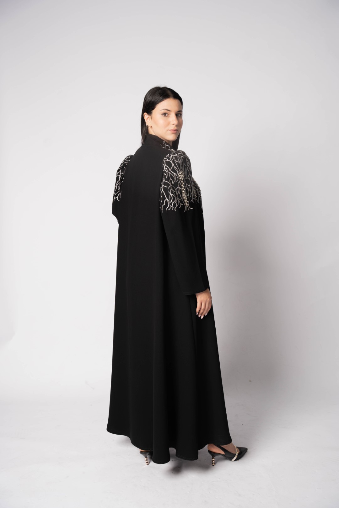 Handcrafted embroidery on the front and sleeves, interwoven with crystal brilliance