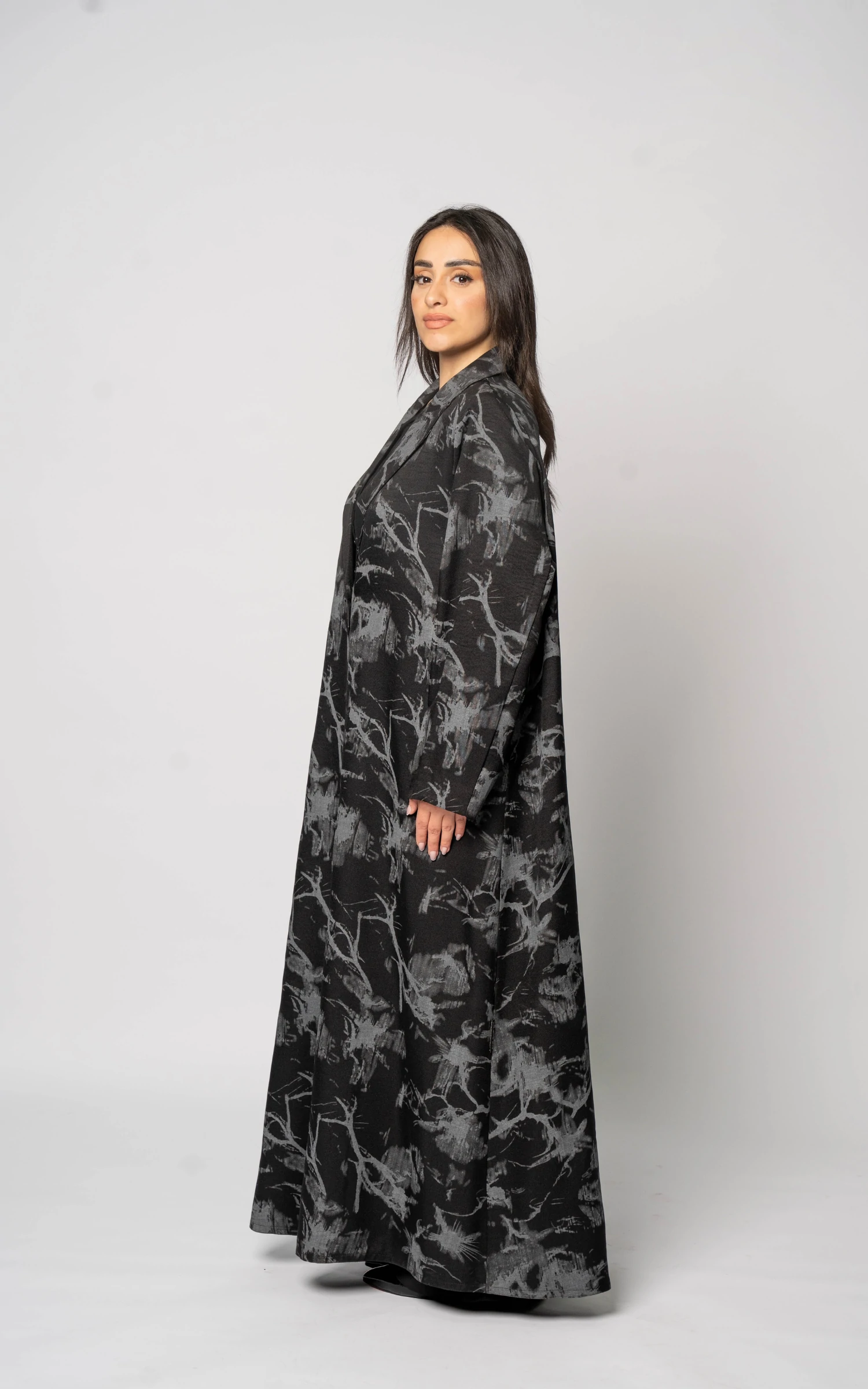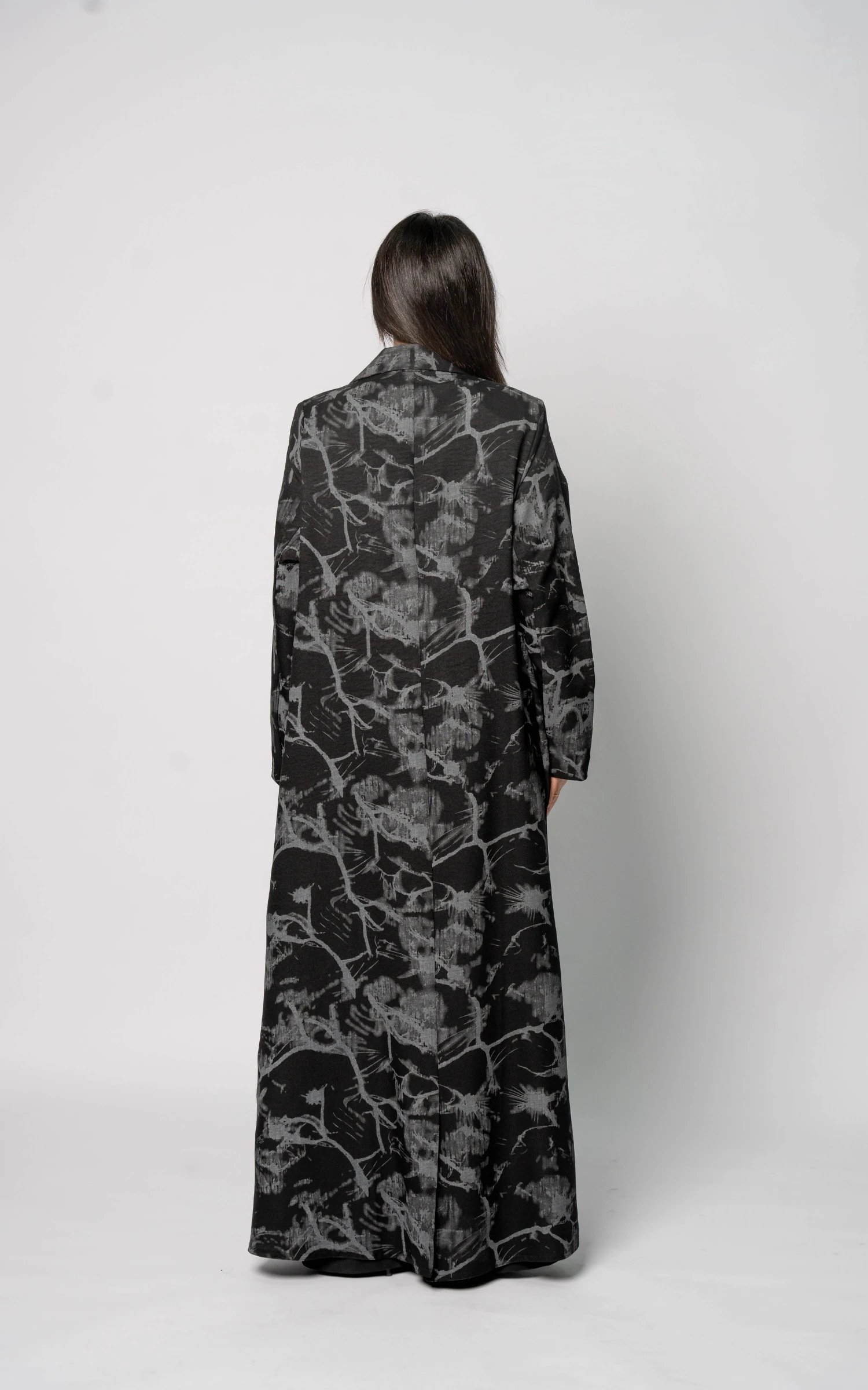 Crafted from our premium linen fabric, Thunder is tailored specifically for the summer season. The lightweight, airy texture ensures comfort even in warm weather, while the dynamic black print adds depth and character to the silhouette. The structured cut enhances confidence, and the flowing length preserves grace in every movement.